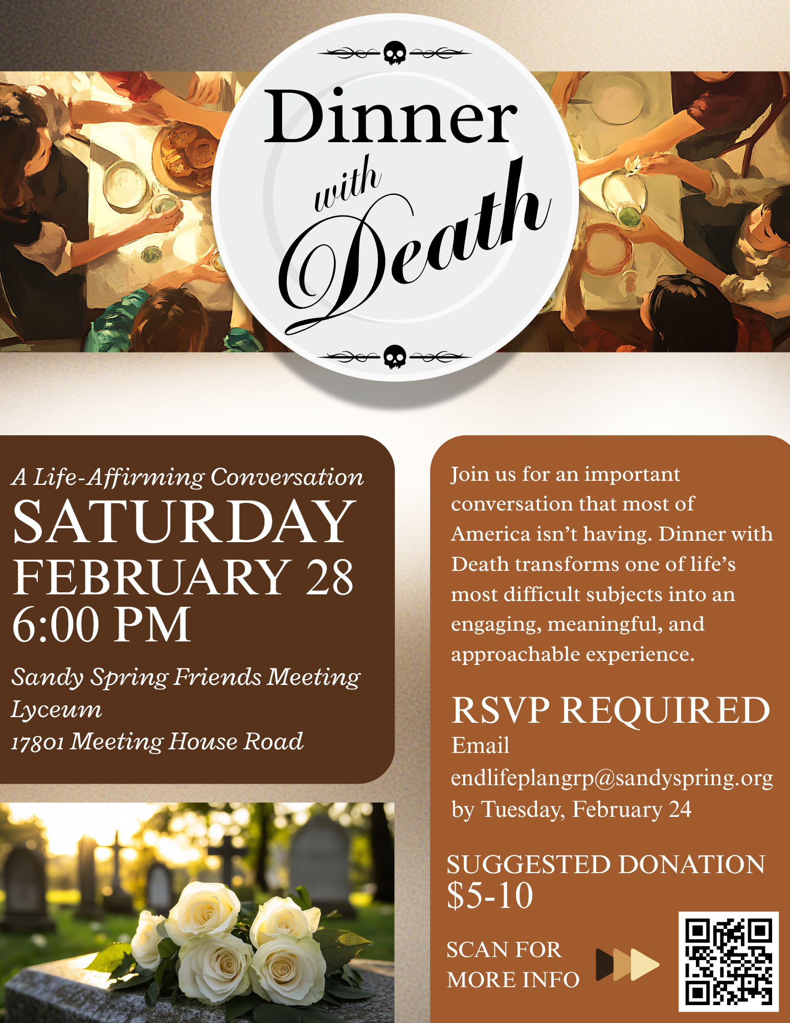 On Saturday, February 28 at 6:00 pm, Sandy Spring Friends Meeting’s End of Life Planning Group invites you to come to the table for a conversation over dinner. Dinner with Death is a chance to explore together in a deeper, more meaningful way. There’s no right or wrong way to process this emotion-laden topic yet many find we need one another to die peacefully. You might find that talking about death is one of the most life-affirming things you can do. We hope you’ll join us!