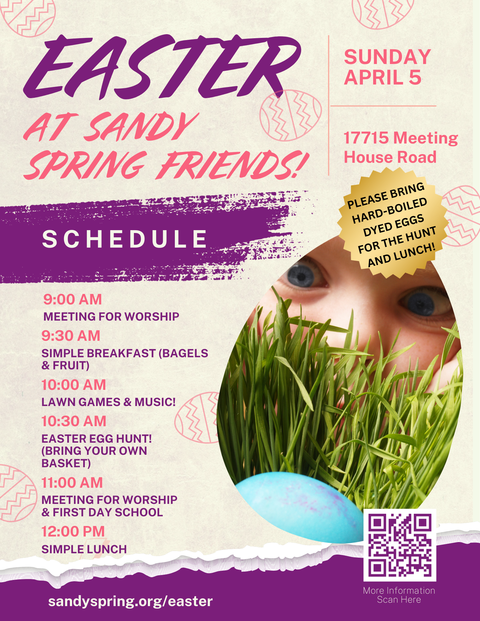 We invite everyone to bring some hard-boiled and dyed eggs for the egg hunt and later for egg salad sandwiches. Egg donations can be left on the table outside the Community House. Please drop them off before 10:00 am.