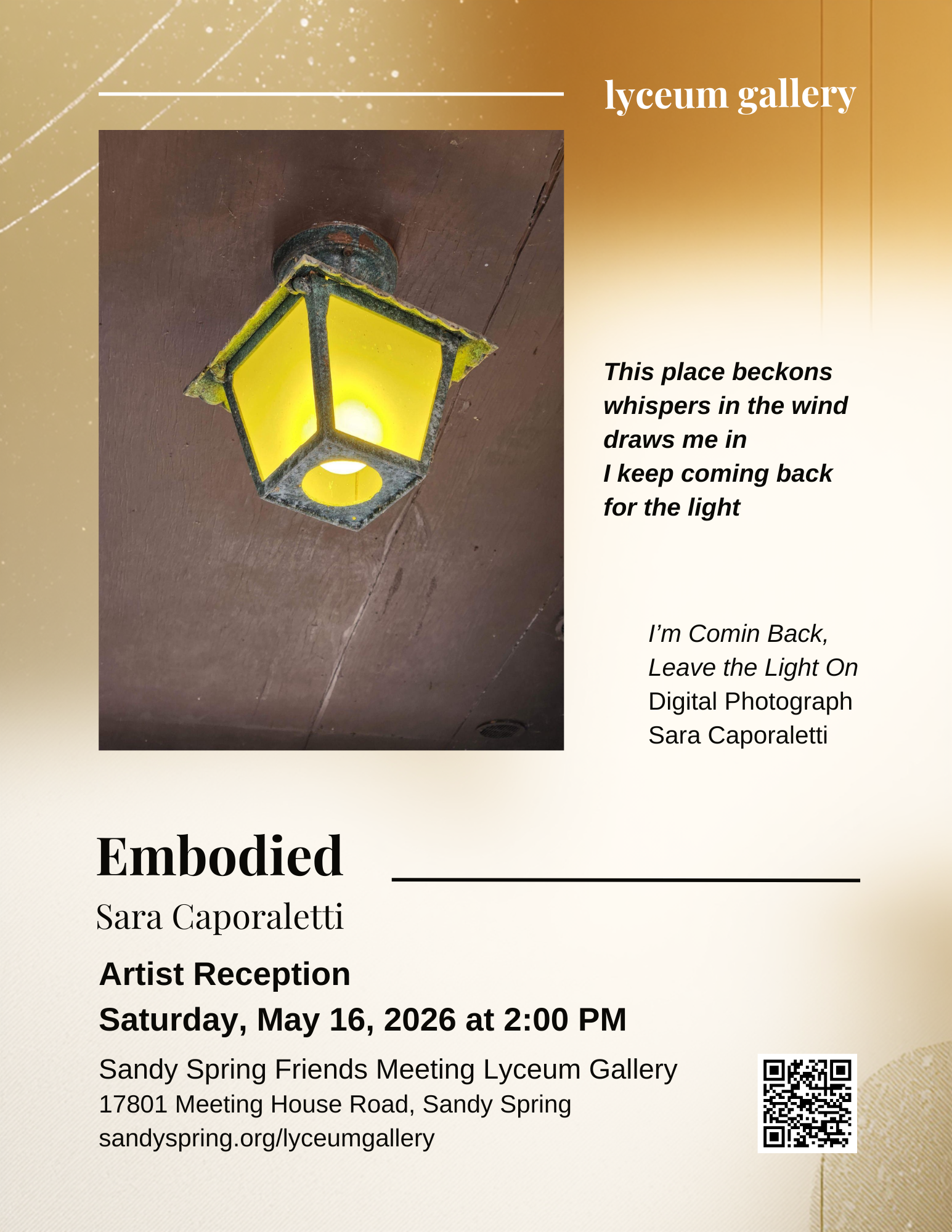Visit Sandy Spring Friends Meeting’s Lyceum Gallery our latest exhibit, “Embodied,” featuring the artwork of Sara Caporaletti. An artist reception is scheduled for Saturday, May 16 at 2:00 pm in the Sandy Spring Lyceum (17801 Meeting House Road).