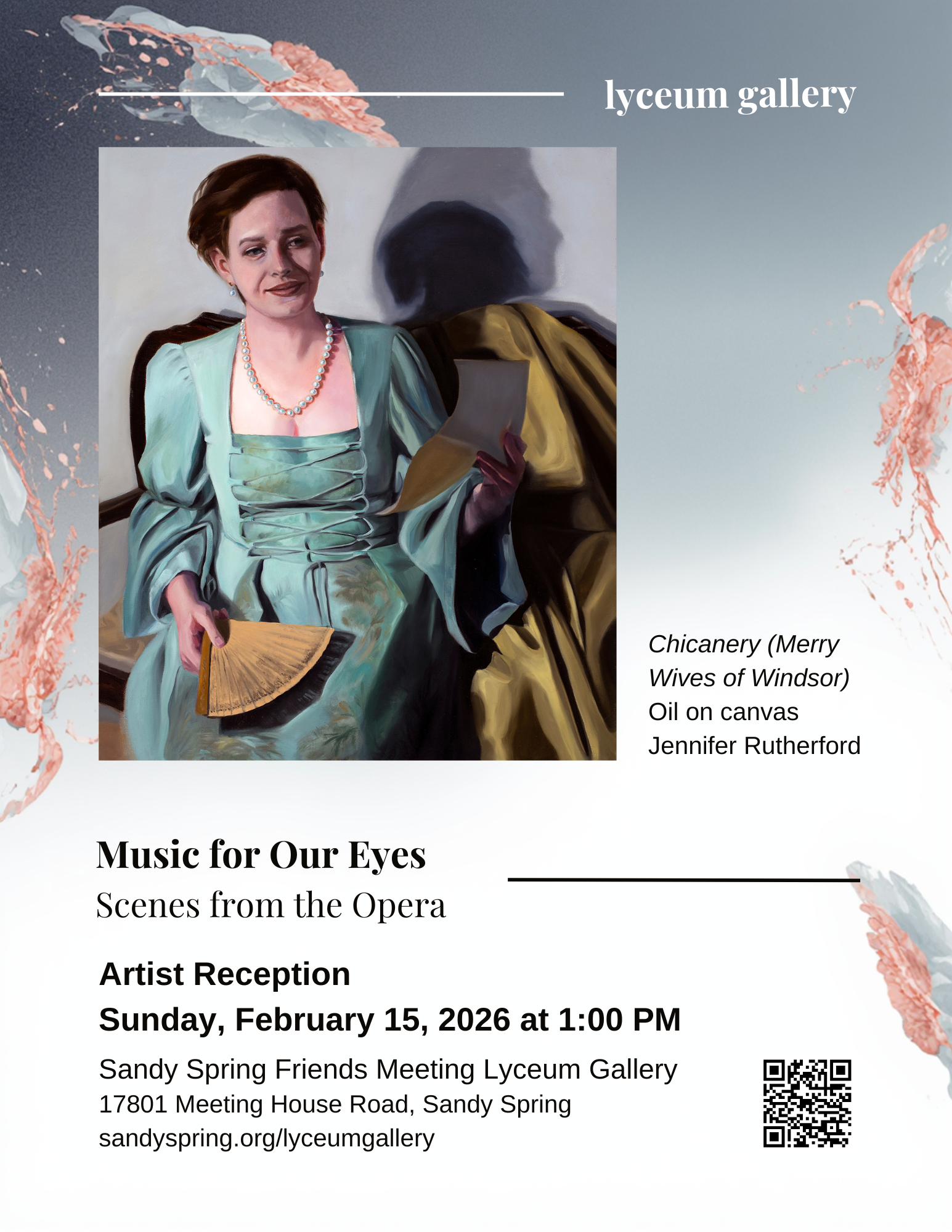 Visit Sandy Spring Friends Meeting’s Lyceum Gallery our latest exhibit, “Music for Our Eyes: Scenes from the Opera,” featuring the paintings of Jennifer Rutherford, on display now to March 31, 2026. An artist reception is scheduled for Sunday, February 15 at 1:00 pm in the Sandy Spring Lyceum (17801 Meeting House Road).